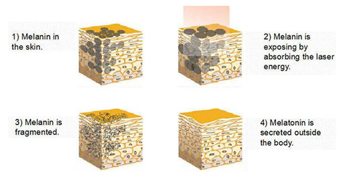 The laser from skincare laser machine penetrates surface skin, reaches pigment in derma. Shortly after absorbing great laser energy, the pigment expands and breaks into small particles which are to be removed from the body. The treatment purpose is achieved.